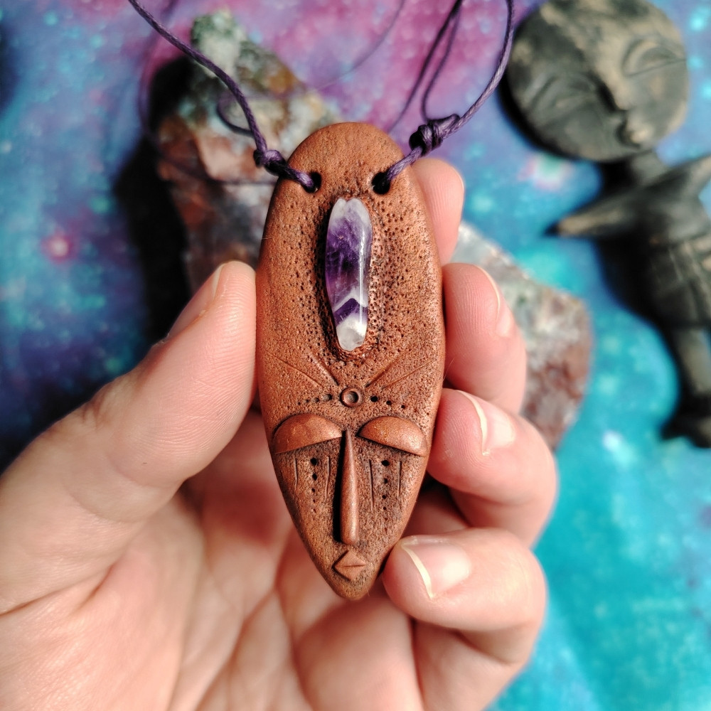 Chevron ametiszt köves ősi medál. Stilizált ősi nő arc, boho stílusú nyaklánc.