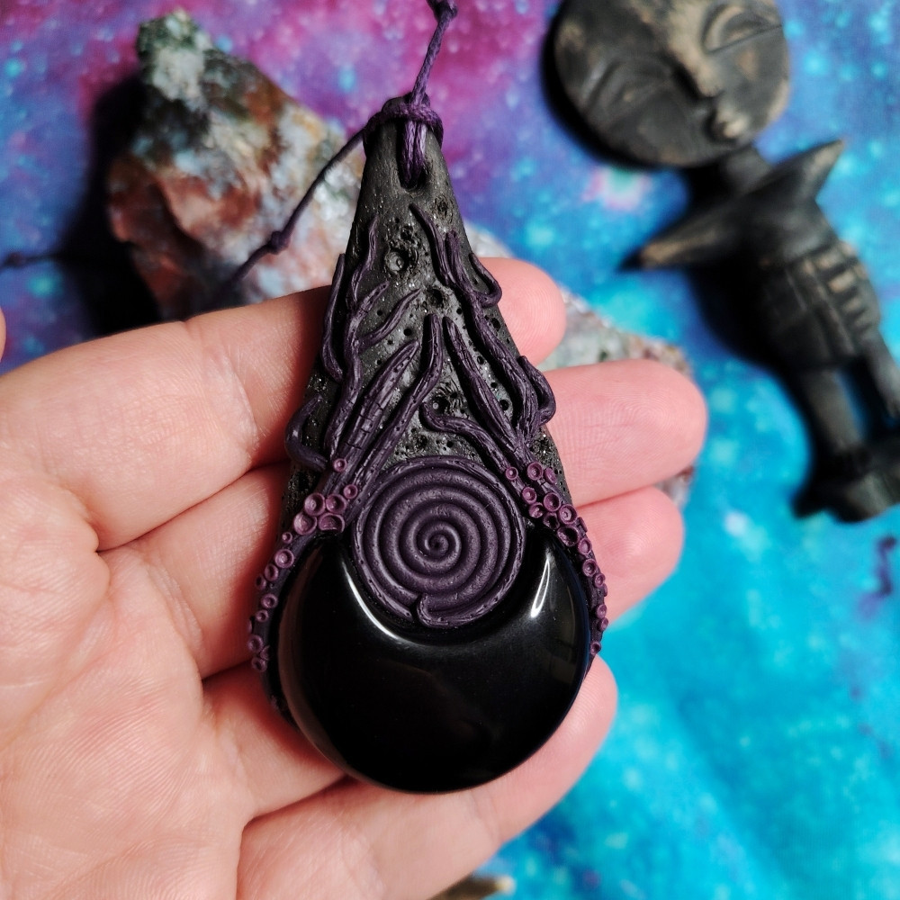 Hold formára csiszolt obszidián, általam formált foglalatban.