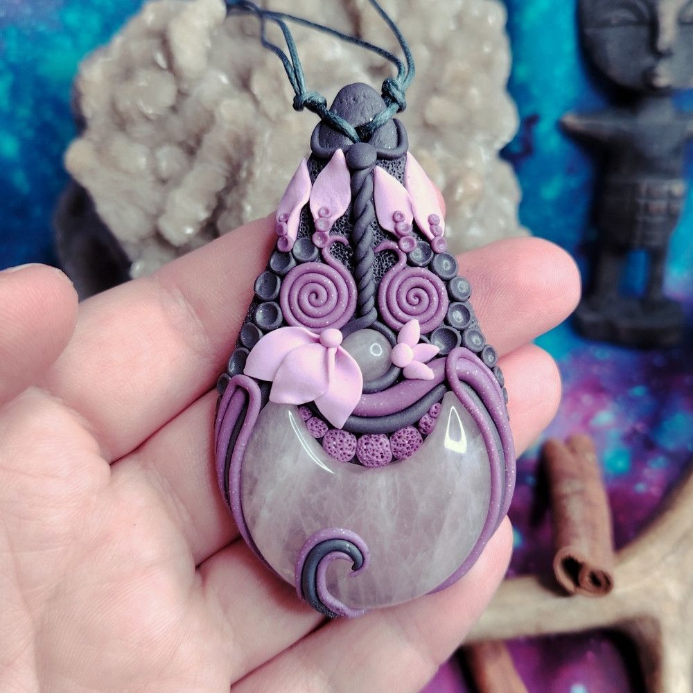 Hold formára csiszolt rózsakvarc, általam formált foglalatban.